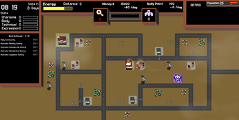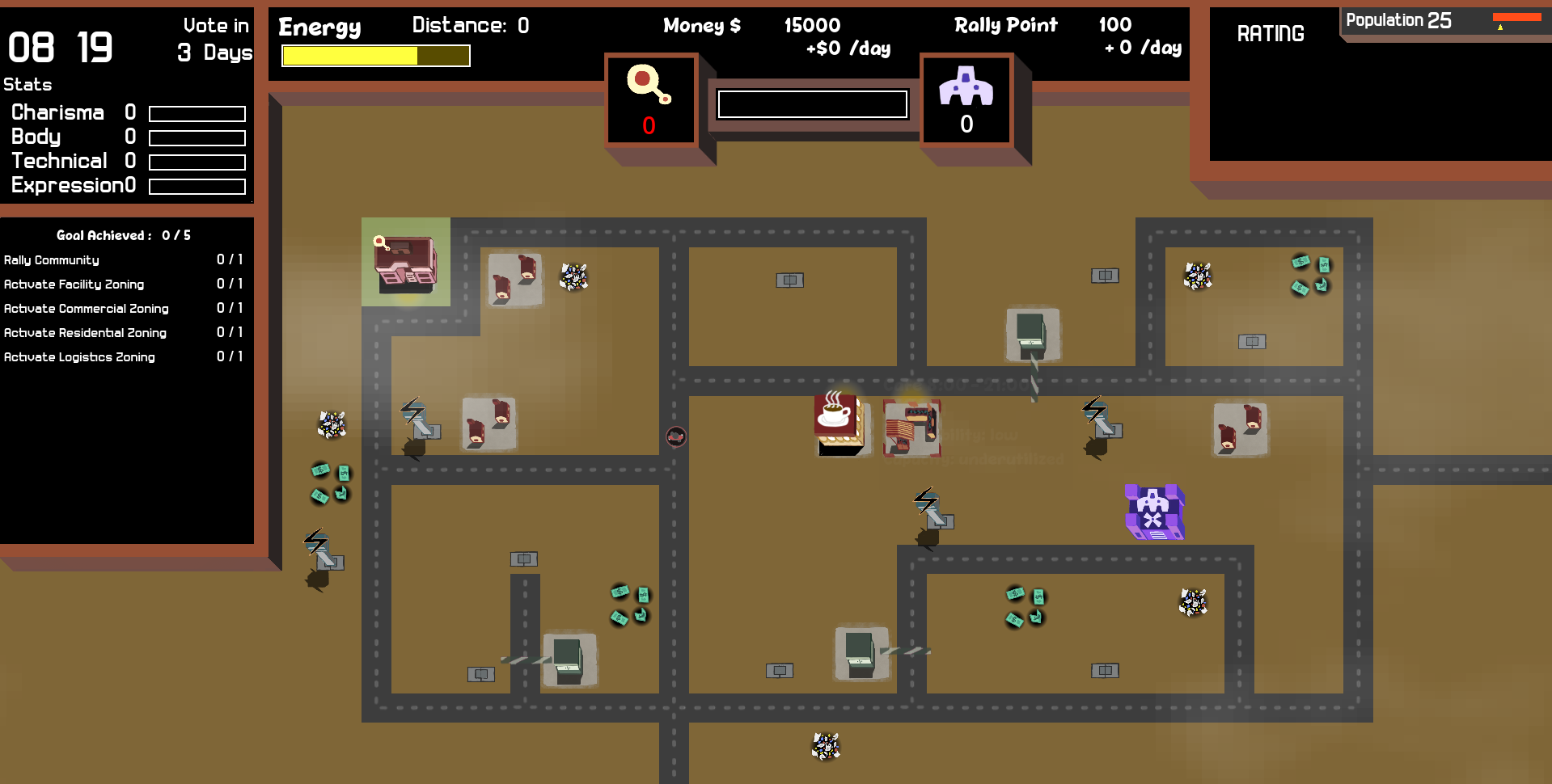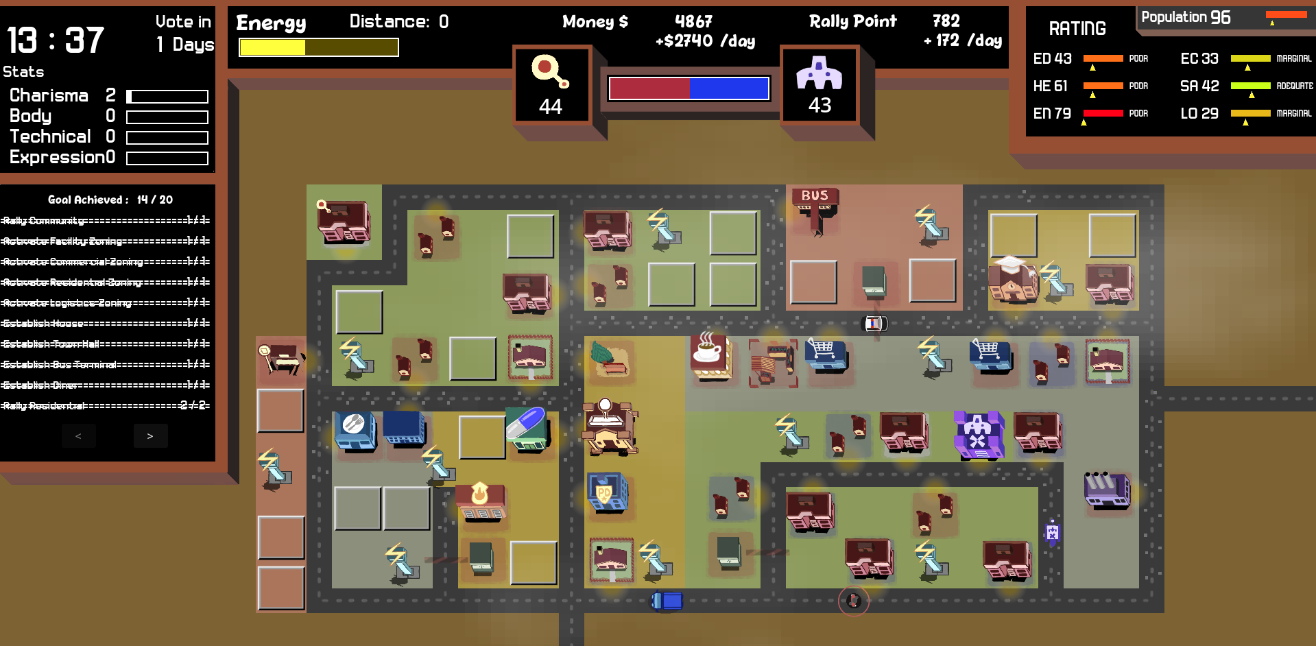 Building commercials, facilities, and transport buildings to attract potential residence. There is rating and demand meter for population as shown in the top-right of the game UI.